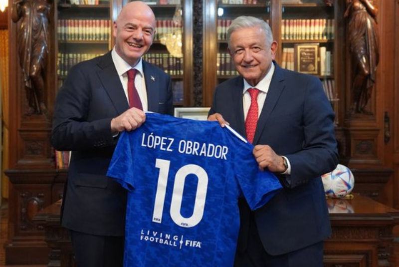 El mandatario Andrés Manuel López Obrador recibió este jueves en Palacio Nacional a Gianni Infantino, presidente de la FIFA, como parte de los preparativos para el Mundial de Futbol de 2026.