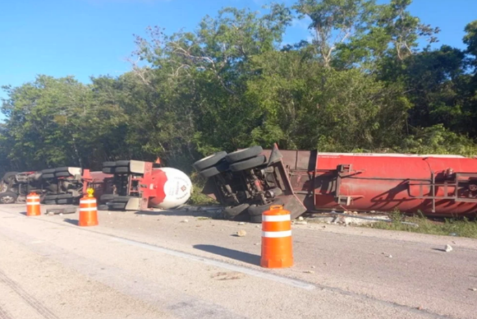 Un camión con dos pipas de gas LP de 80 mil litros perdió el control y terminó volcado a la altura del kilómetro 115+800 de la autopista Mérida- Cancún.