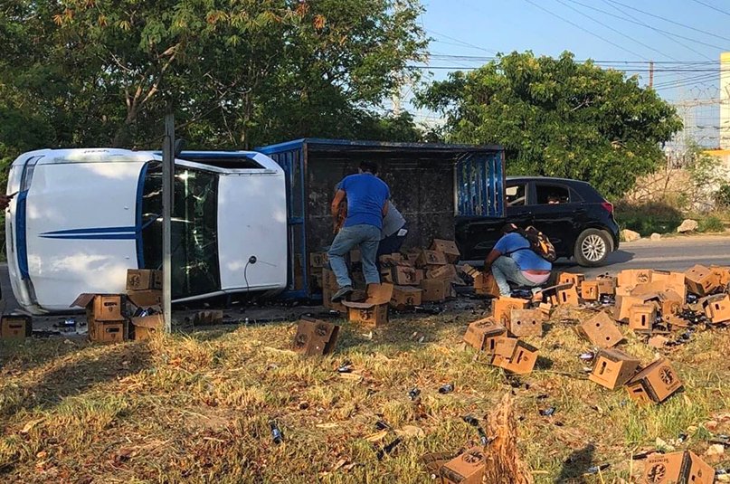 La camioneta volcó de costado izquierdo y se arrastró varios metros dejando regados varios cartones de cerveza que además se rompieron.