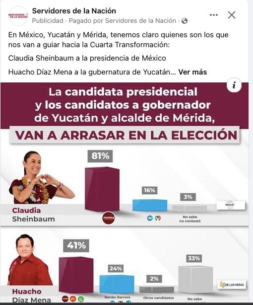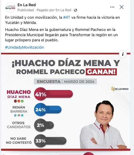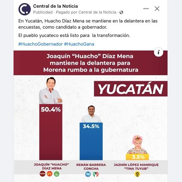 De “De las Heras”, la cuenta “Servidores de la Nación” difunde en encuesta pagada que Díaz Mena tiene el 41% de las preferencias electorales sobre el 24% de Renán Barrera Concha, y la cuenta “En la Red” pagó para esa misma promoción. La anónima, en publicidad pagada por la cuenta “Central de la Noticia”, la diferencia es abismal, Renán Barrera y su equipo, con sus 34.5 puntos, ya pueden ir preparando sus maletas: Díaz Mena tiene un inalcanzable 50.44%