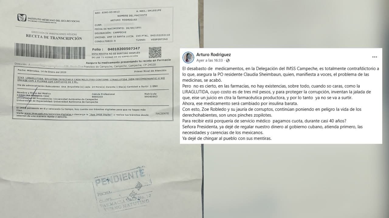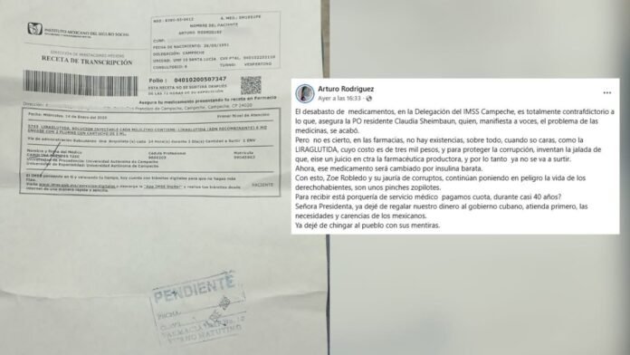 En su publicación, el denunciante asegura que en farmacias del IMSS en Campeche no hay disponibilidad de ciertos medicamentos, especialmente los más costosos, y sostiene que se ha argumentado la existencia de litigios con farmacéuticas como motivo para no surtirlos. Asimismo, criticó directamente al director general del instituto, Zoé Robledo, a quien responsabilizó de la situación.