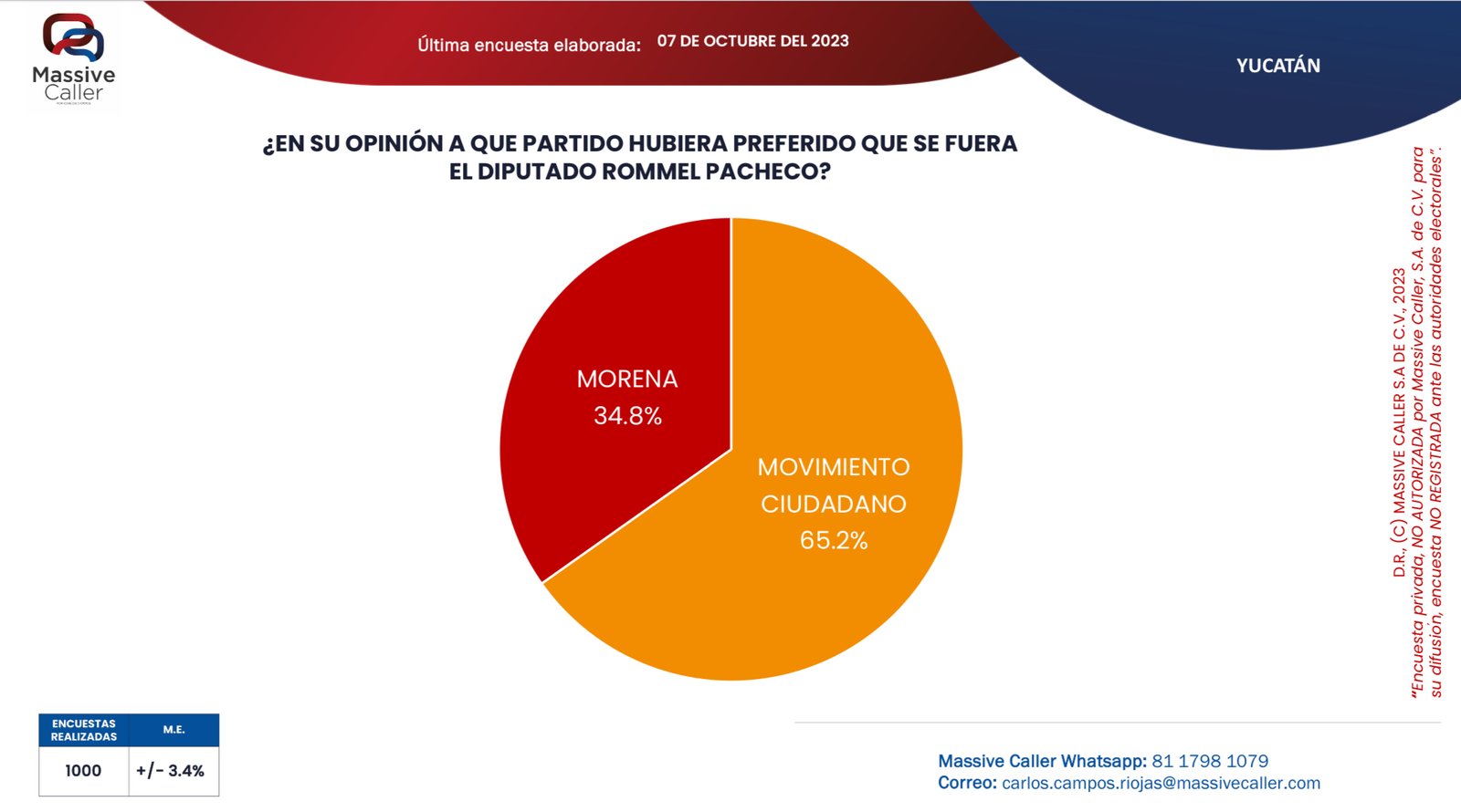 Esto fue reflejado por la firma consultora Massive Caller, quien confirma que de un universo del 100 por ciento de entrevistados el 73.2% de ellos, es decir, 7 de cada 10 no estuvo de acuerdo con el cambio de partido del ex clavadista del PAN a Morena, y solo el 26.8% de ellos dijo estar de acuerdo con este cambio de Pacheco Marrufo.
