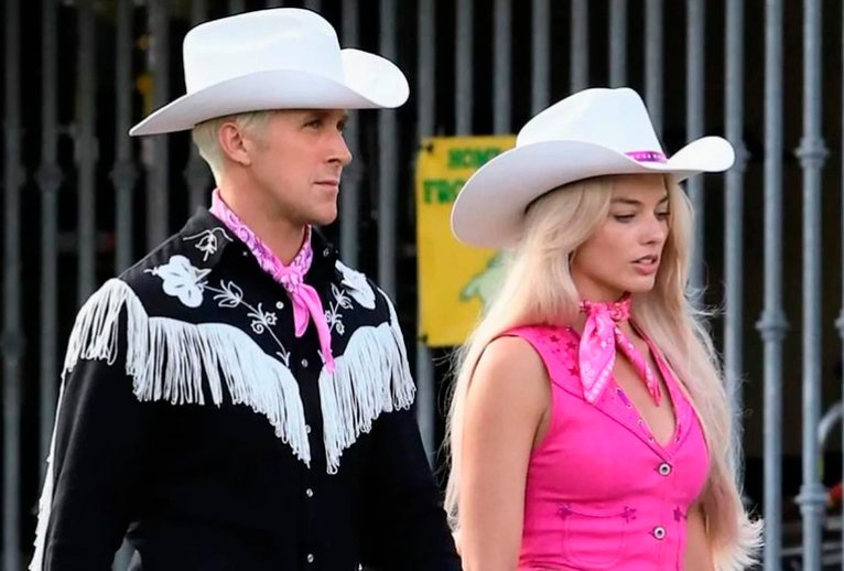 En las imágenes se puede observar que Margot está utilizando un traje estilo vaquero de dos partes de color rosa mexicano. Asimismo, Robbie tiene un pañuelo en el cuello y un sombrero tipo vaquero de color blanco.