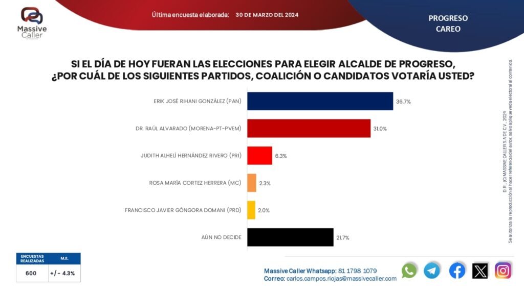 En el arranque de su campaña por la presidencia municipal de Progreso, el aspirante panista Erik José Rihani González mantiene la ventaja en la carrera por la alcaldía del principal puerto yucateco, pues está 5.7 puntos arriba de su más cercano competidor, según difundió este domingo la casa encuestadora Massive Caller.