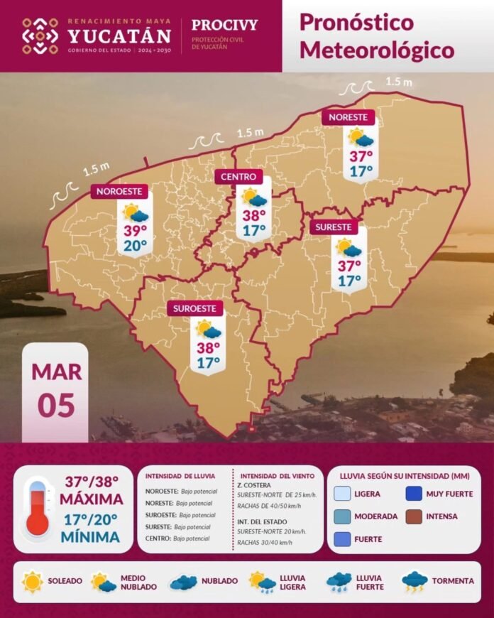 Para este miércoles 05 de marzo, inicialmente el ambiente será muy caluroso sobre el estado de #Yucatán, oscilando la temperatura máxima entre 37° y 39°C en el interior del estado y de 28° a 30°C en la zona costera.