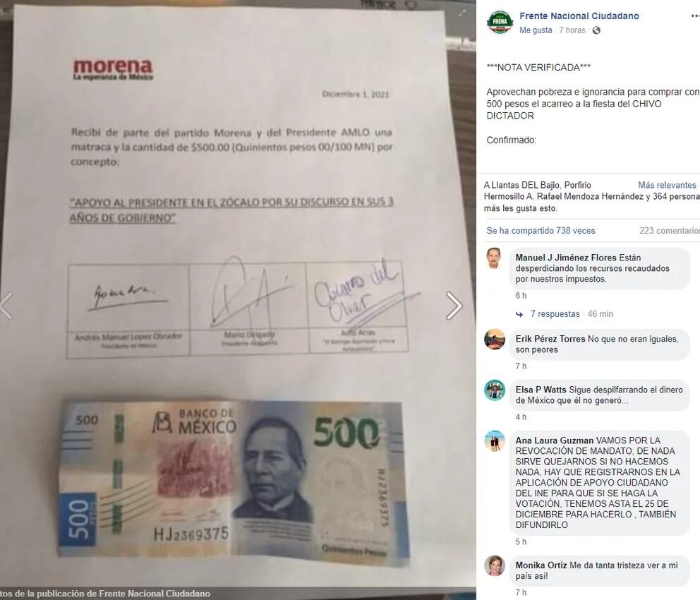Ya dos años antes, Morena había sido exhibido a nivel nacional por entregar recibos en sus acarreos. En las papeletas, pedían la firma del beneficiario de los 500 pesos y una matraca, para justificar sus gastos.