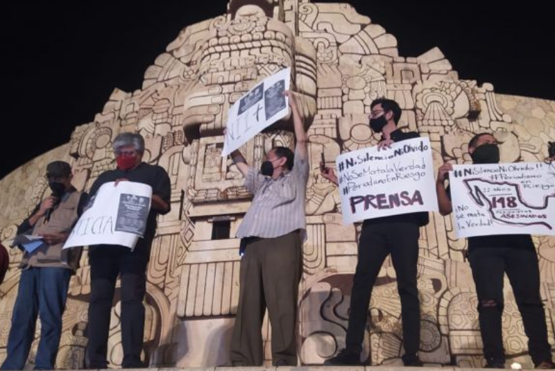 En las escaleras del Monumento a la Patria, los periodistas colocaron veladoras mientras el grito de justicia se escuchaba por todo Paseo Montejo, pues no sólo pidieron por lo compañeros a nivel nacional, también por los reporteros y fotógrafos a nivel local que han sido agredidos o intimidados por alguna autoridad al hacer su labor periodística.