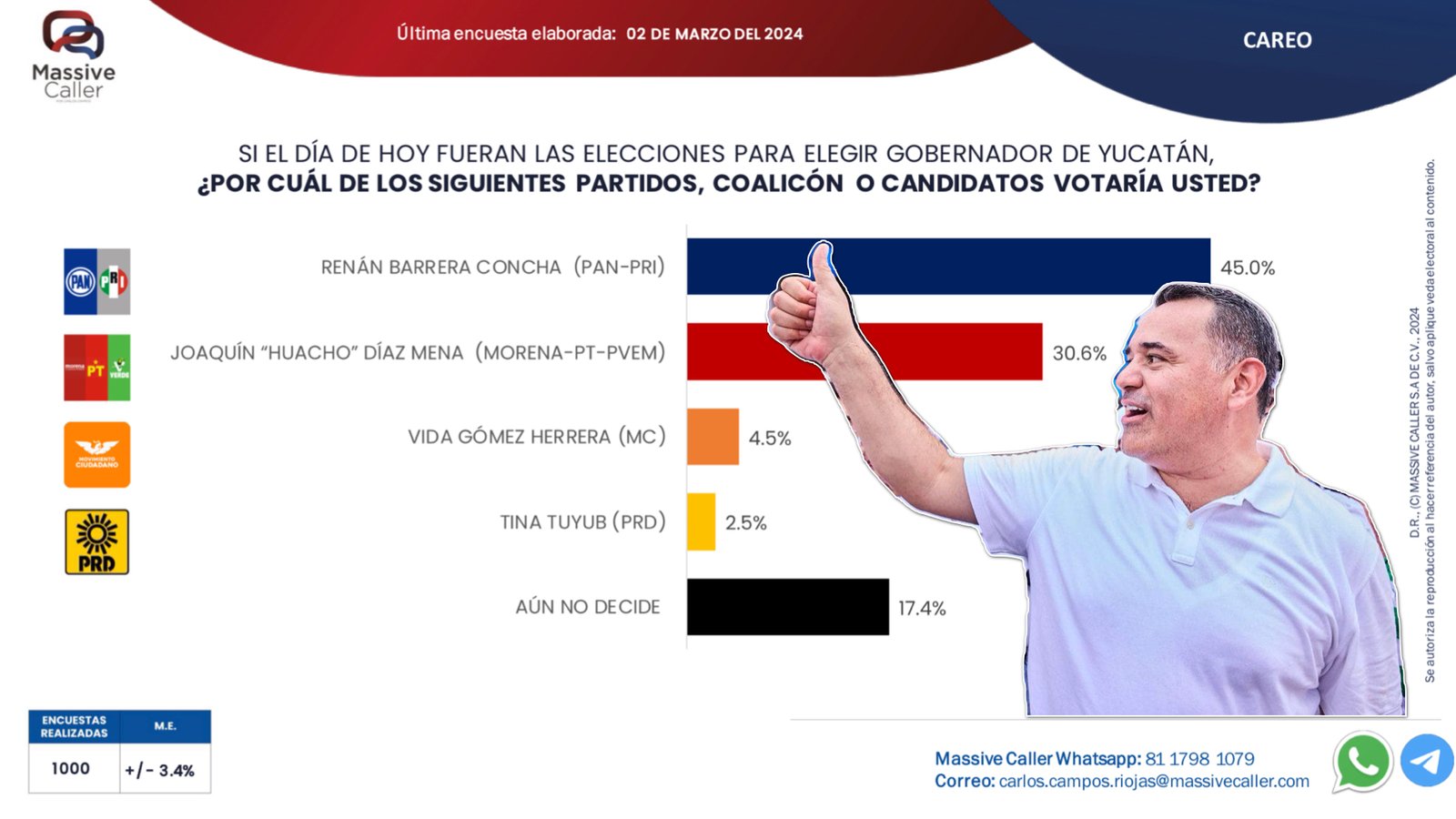 Según datos proporcionados por Massive Caller, previo al inicio de su campaña, Barrera Concha ya contaba con una ventaja de 10 puntos porcentuales sobre su rival más cercano. Sin embargo, este margen se ha ampliado en casi 15 puntos, consolidando aún más su posición como favorito entre los votantes.