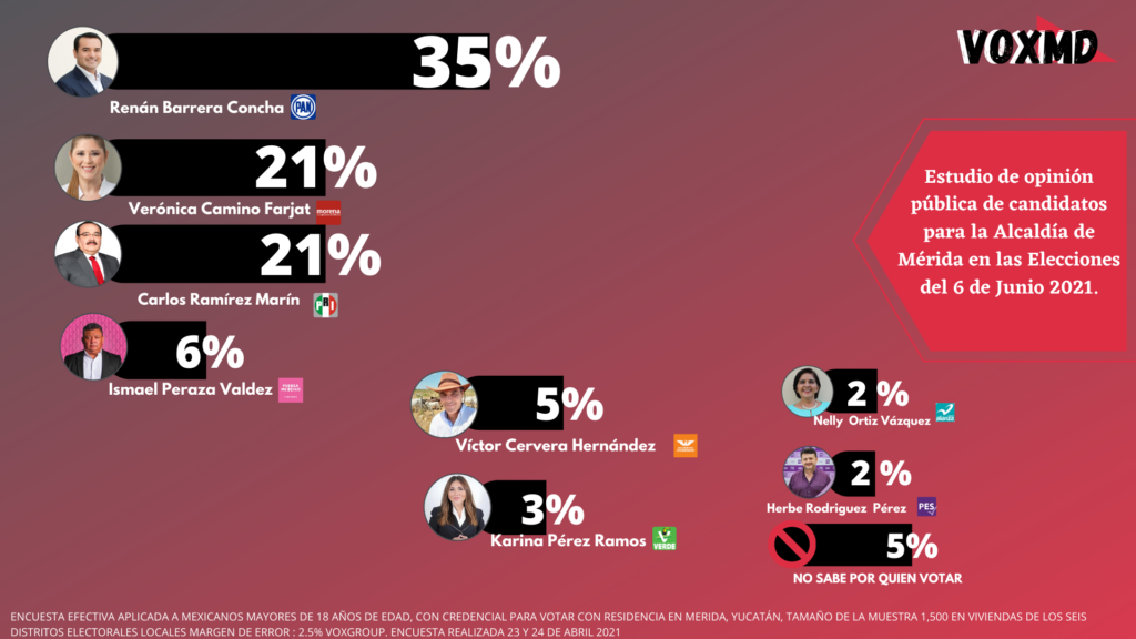 Esta encuesta efectiva fue aplicada a mexicanos mayores de 18 años de edad, CON CREDENCIAL PARA VOTAR CON residencia en MÉRIDA, Yucatán, a 1,500 en viviendas de los seis distritos electorales locales margen de error: 2.5% VOXGROUP.