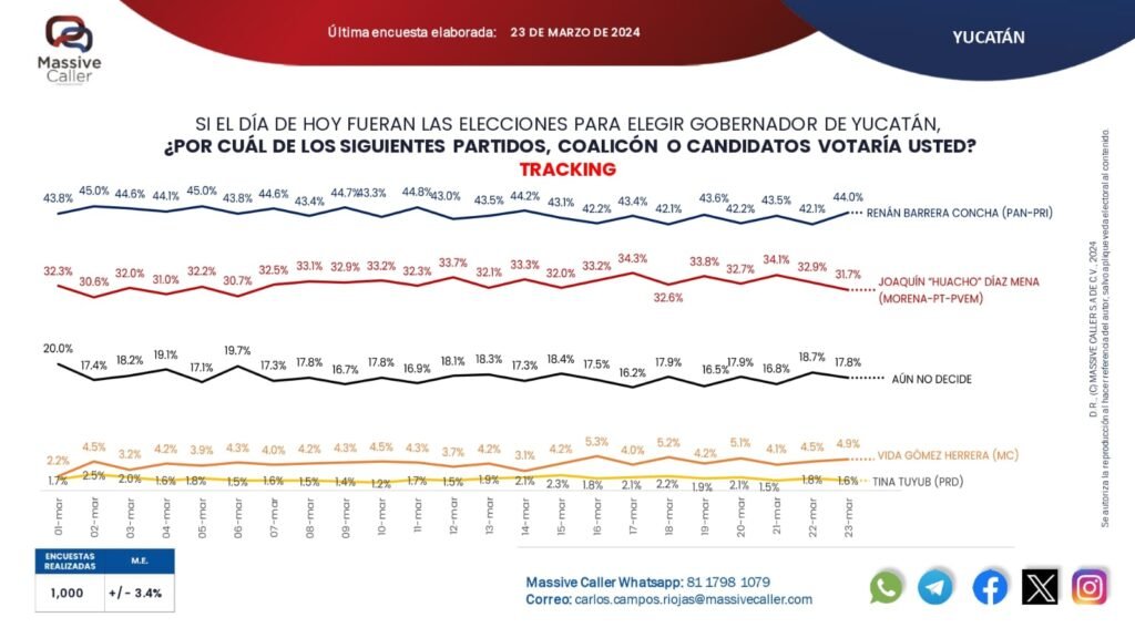 Aunque aún persiste un 17.8% de votantes indecisos, este porcentaje ha disminuido en comparación con mediciones anteriores. Renán Barrera Concha ha experimentado un crecimiento de 1.8 puntos en la última semana, mientras que Joaquín Díaz Mena ha sufrido una pérdida de hasta 3 puntos durante el mes de marzo.