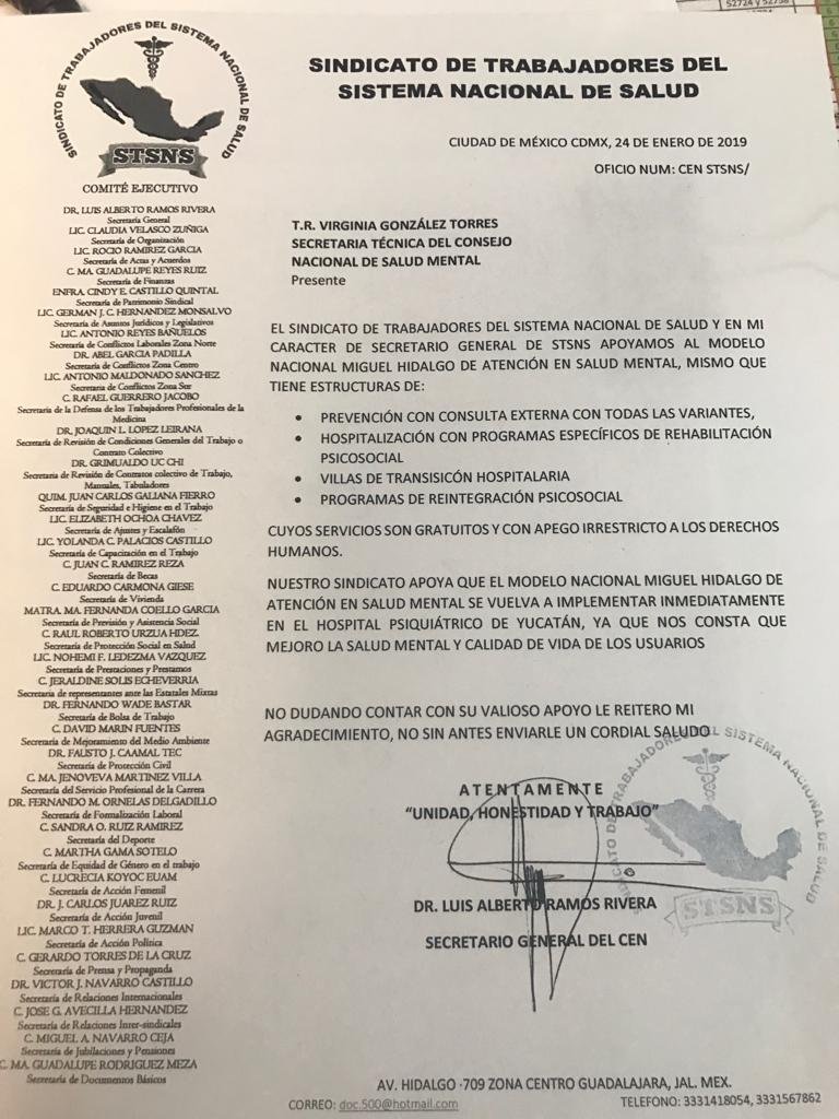 “Levantamos la manos para pedir a la SSY la reinstalación del Modelo Hidalgo en el Psiquiátrico “Yucatán”, para que las personas cuenten con un programa que los trate con dignidad además de que los trabajadores cuenten con las instalaciones adecuadas para efectuar sus actividades profesionales”, acotó.