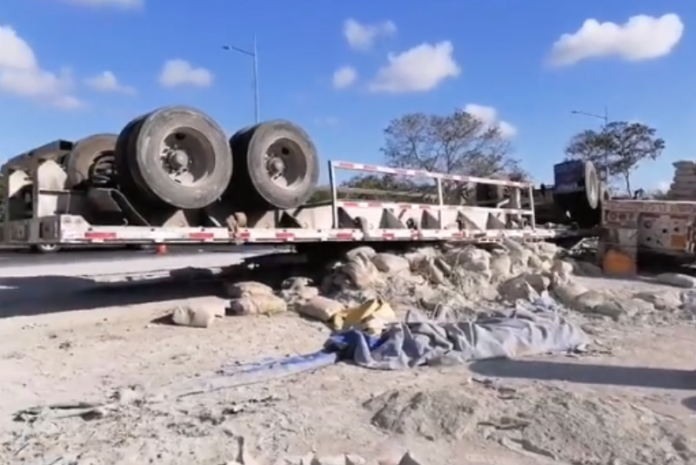 Un remolque con 20 toneladas de cemento volcó esta mañana en el kilómetro 8 de Periférico Sur de Mérida.